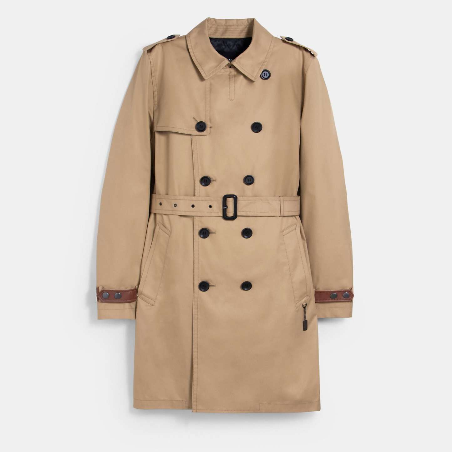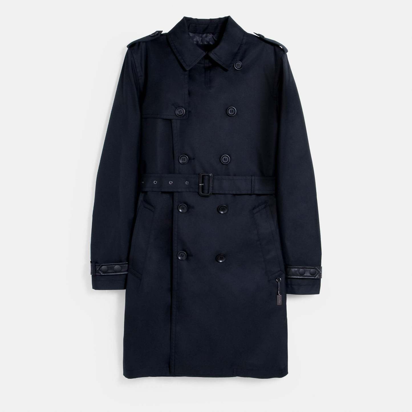 68% cotton 32% polyester Lining - 100% polyester Leather details Button closure Slip pockets Adjustable belt Length - 41 Style No. C5235 | Outlet Trench Coat - Black, Size - 2X-Large