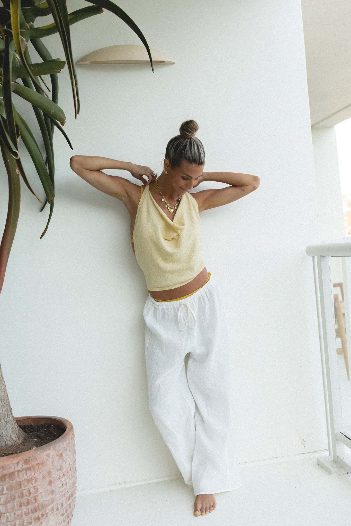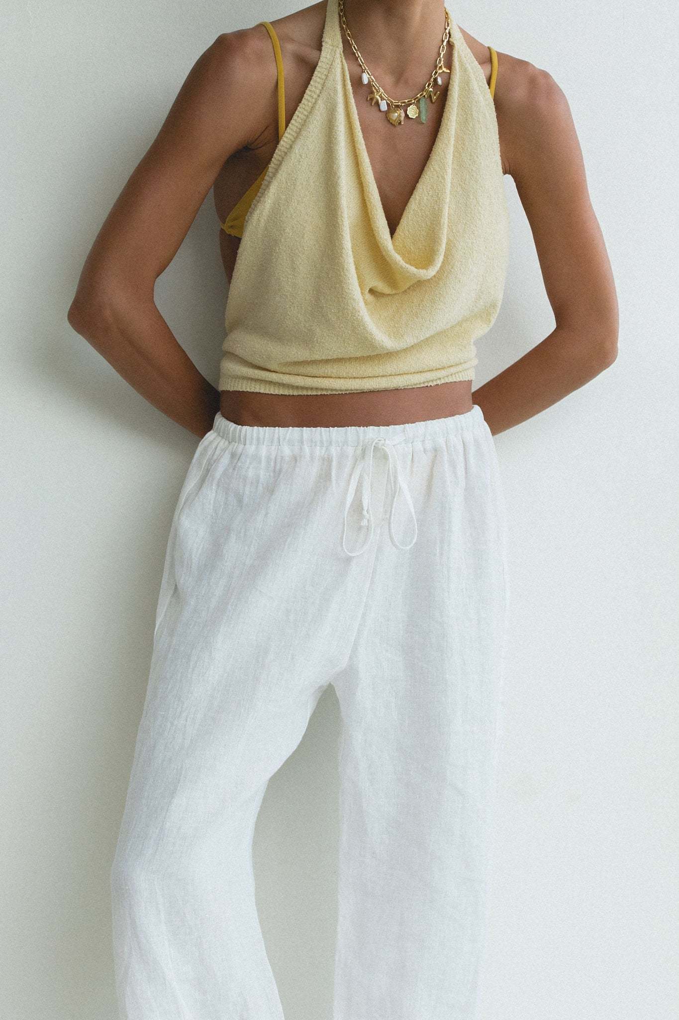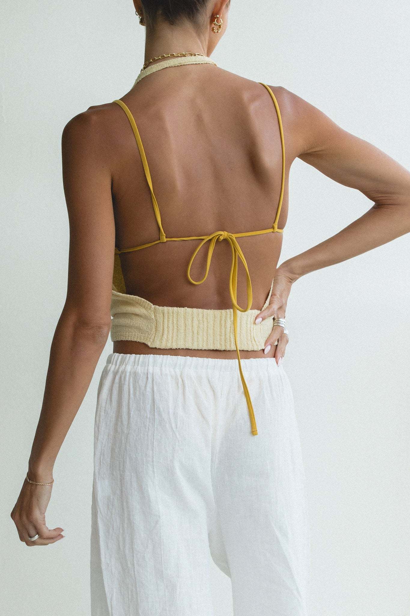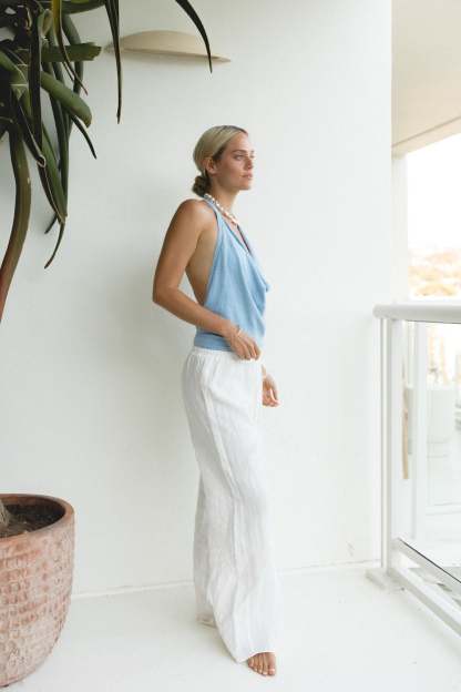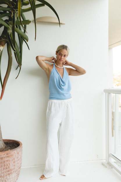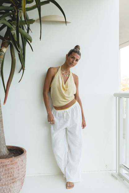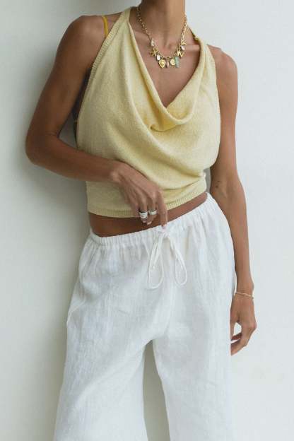 Introducing the Dusk Cotton Knit Halter Top - a must-have for any summer wardrobe. This backless top is perfect for a day at the beach or a sunny summer day, making a cool statement and providing ultimate comfort. Made with high-quality cotton, it's the perfect addition to slip over a bikini or pair with your favorite beachy bottoms.