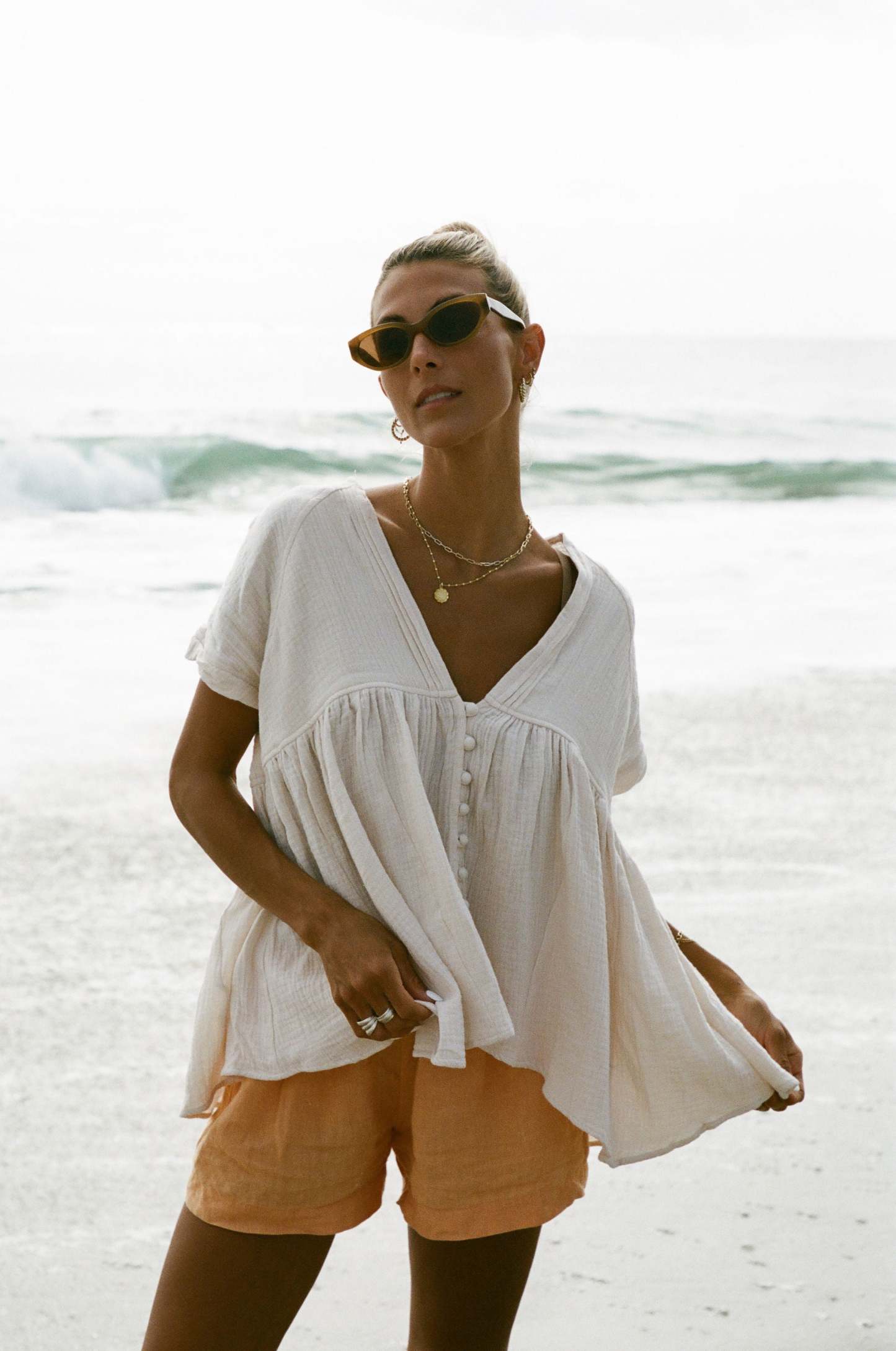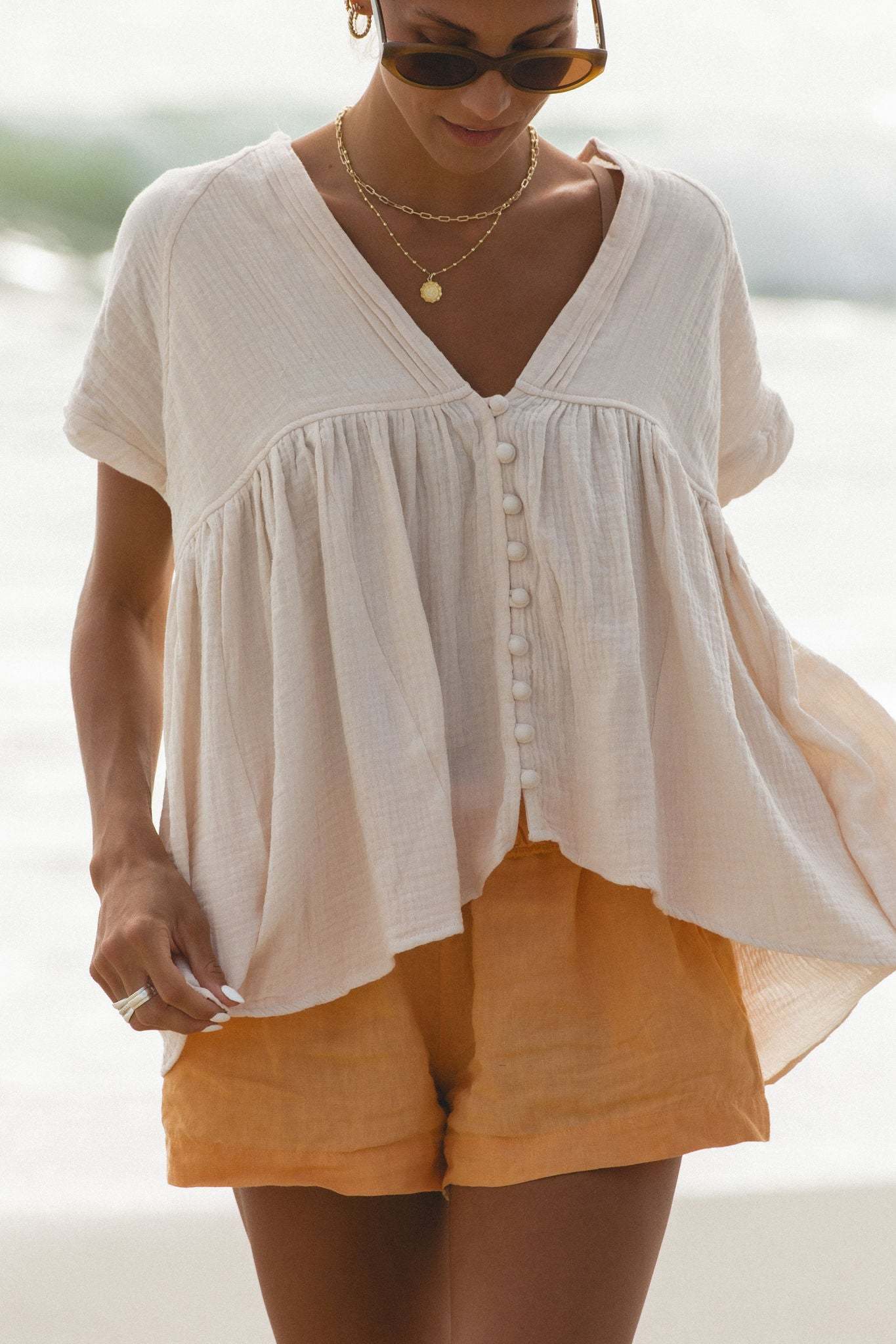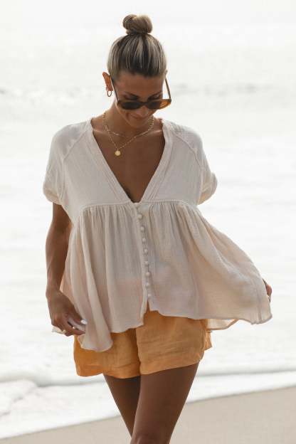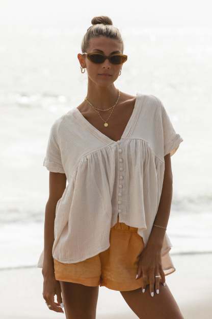 The Beachy Head Cotton Gauze Top is a flowy and lightweight short sleeve top. Its babydoll style is perfect for warm weather and provides a comfortable and airy fit. Made with high-quality cotton gauze, ideal for late summer.