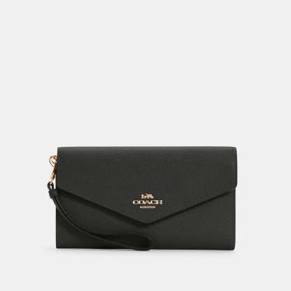 Crossgrain leather Five credit card slots ID window Inside zip and open pockets Snap closure Outside zip coin pocket Detachable wrist strap 8 1/4 (L) x 4 1/2 (H) Style No. C0707 | Outlet Travel Envelope Wallet - Black