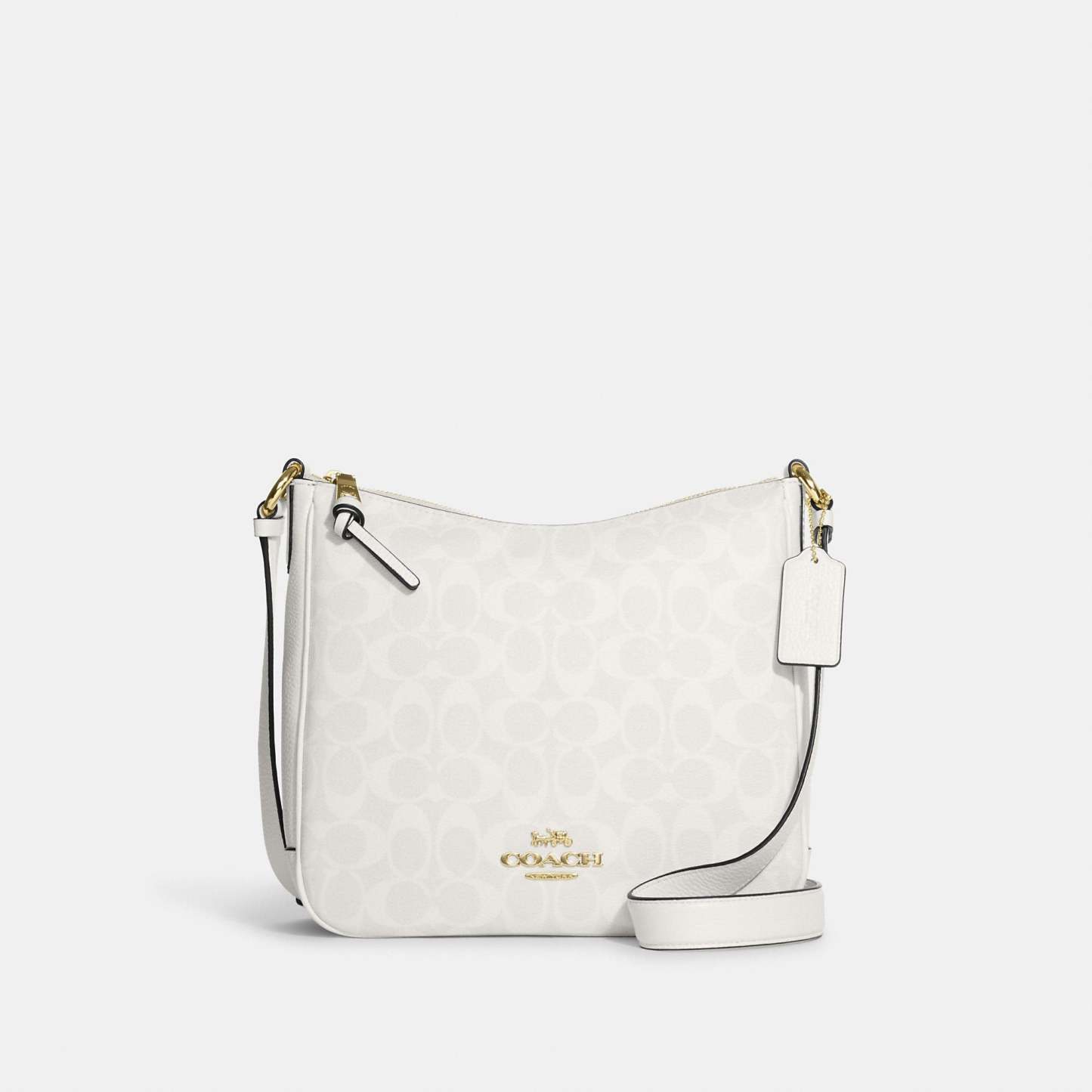 Signature coated canvas and refined pebble leather Inside multifunction pocket Zip-top closure fabric lining Outside zip pocket Adjustable strap with 21 drop for shoulder or crossbody wear 10 1/4 (L) x 9 1/2 (H) x 2 3/4 (W) Style No. C1649