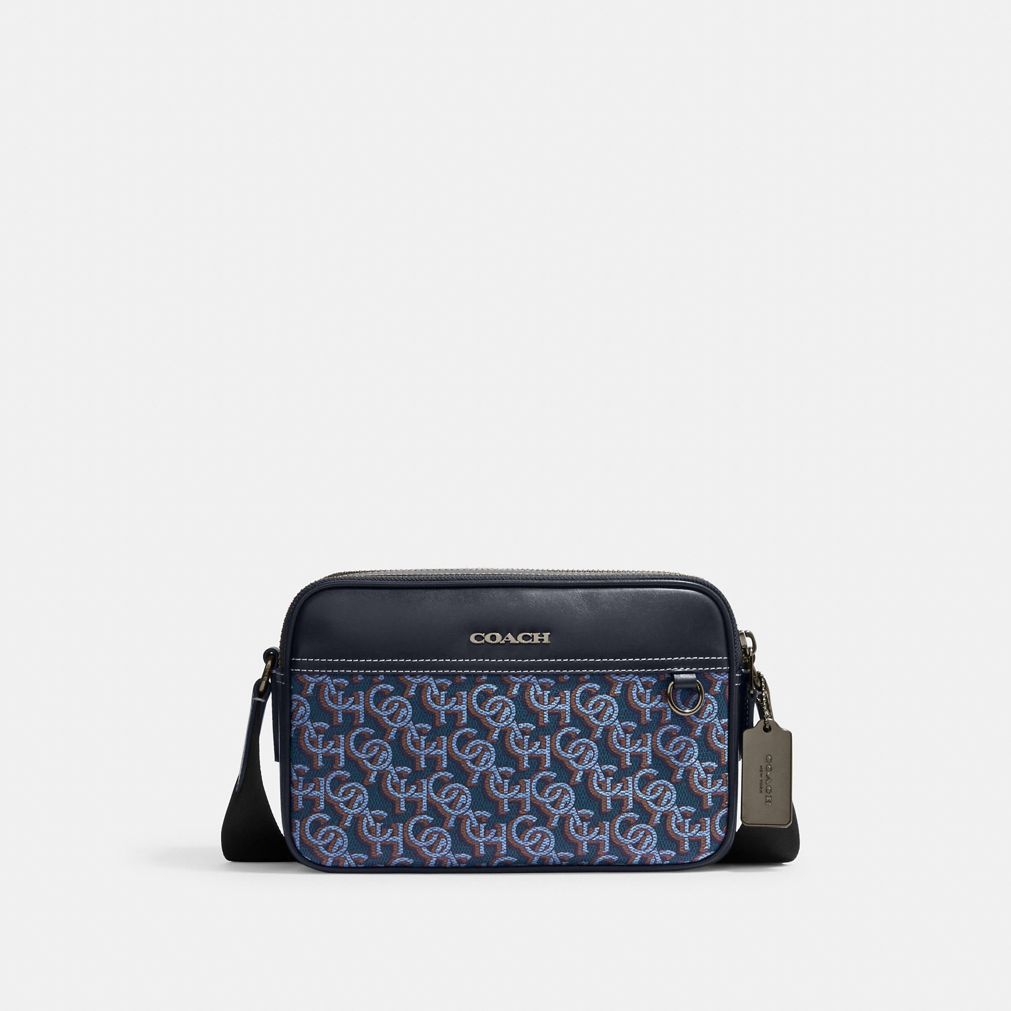 Printed coated canvas and refined calf leather Inside multifunction pockets Double zip closure fabric lining Outside slip pocket Adjustable strap with 25 drop for shoulder or crossbody wear 9 (L) x 5 3/4 (H) x 2 3/4 (W) Style No. CF484 | Outlet Graham Crossbody With Monogram Print - Black